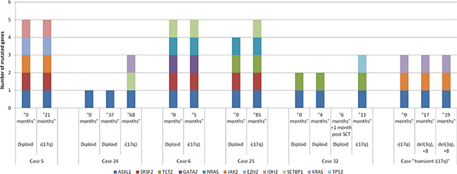 Within this study cohort, 5 cases had an initial diploid karyotype and subsequently acquired i(17q). We performed mutation analysis on these patients at various time points during the evolution from diploid to karyotype showing i(17q) (as shown in Figure 2). Within the interval between the initial analysis to the development of i(17q) abnormality, all patients had undergone treatment with drugs that included decitabine, Ruxolitinib, hydroxyurea, dasatinib and lenalidomide. In one case, the i(17q) abnormality was acquired post-allogeneic stem cell transplantation. Mutations in ASXL1, SRSF2 and RAS appear stable over time. ASXL1 mutations were present in all 5 cases at both diploid and i(17q) stages of karyotypic evolution. SRSF2 mutations were also present at both diploid and i(17q) stages in 3 of 5 patients. Mutations in NRAS (n = 2) and PTPN11 (n = 1) at high allelic frequencies (> 35%) were also stable, being present at the diploid and i(17q) stages. In 3 patients, additional mutations were observed at the time of i(17q) abnormality. These mutations occurred in SETBP1 (n = 2), KRAS (n = 1, subclonal, 7%) and TP53 (n = 1, subclonal, 5%; post allogeneic stem cell transplant) genes. The only case that showed SETBP1 mutation at the time of diploid karytoype developed i(17q) within 5 months.