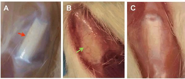 Figure 1: The effect of MTR on gross morphology of aging rat patellar tendons. A. Young tendon (3 months); B. Aging tendon (20 months); C. Aging tendon after MTR. Compared to young tendon A. aging tendon B. appears vascular and less intact. After MTR C., aging tendon has regained its intact structure and has decreased number of blood vessels.