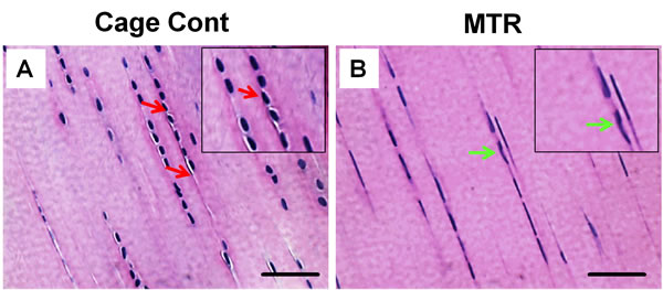 Figure 2: The effect of MTR on the structure and cellularity of aging rat patellar tendon. A. Tendon section from cage control aging rat. B. Tendon section from aging rat after MTR. It is evident that MTR increases the number of typical tendon cells that are more elongate (green arrows) B. and decreases the number of round shaped cells presumably non-tenocytes (red arrows) A.. Insets represent magnified sections. Bars: 50 µm.