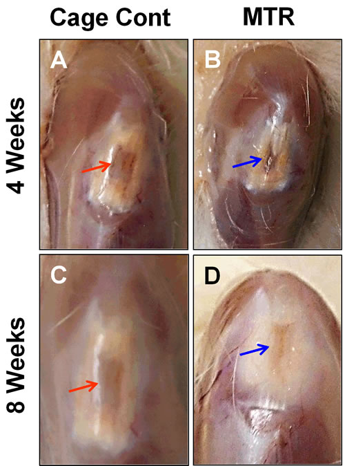 Figure 3: The effect of MTR on wound healing in aging rat patellar tendon. A., C. Control aging tendons. B., D. Tendons from aging rats after MTR. At 4 weeks, the window defect in control aging rats A. appears bruised and vascular. But MTR accelerated healing of the wound B., which is evidently smaller and seems to be closing (blue arrow). At 8 weeks, the wound in the control group still looks bruised and vascular (red arrow) C., whereas in the MTR group D. the wound for the most part appears to be healed.
