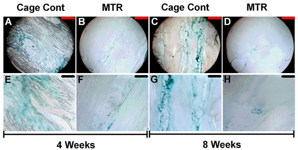 To further evaluate the effects of mechanical loading on aging tendon tissue, we investigated the effects of MTR on senescent cells in the patellar tendons of aging rats. Our results showed that after 4 weeks, over 90% of the wound area in the cage control tendons stained positive for the senescence marker, β-gal (turquoise blue, Figure 5A-5E); however, less than 30% of the tendon wound in the MTR group stained positive for β-gal (Figure 5B-5F). Similar but more pronounced decrease was observed after 8 weeks in MTR group (Figure 5D-5H) while the decrease in the control group was not marked (Figure 5C-5G). At a higher magnification, large gaps are also visible in the cage control group (Figure 5C-5G) and may be caused due to the weak tendon structure collapsing during the sectioning of tendon tissue. In contrast, the MTR group does not have any gaps (Figure 5D-5H) likely due to the increased strength and structure of these tendons that hold together during the sectioning process.