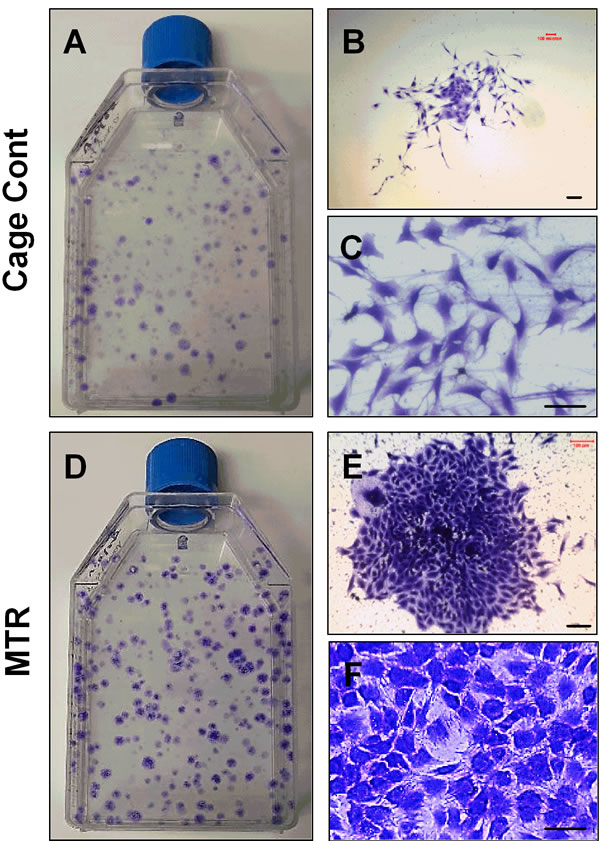 Figure 6: MTR increases the colony number and colony size of TSCs from aging rat patellar tendons. A., B., C. - TSCs from control aging rats; D., E., F. - TSCs from aging rats after MTR. The number of colonies in control aging rats A. is much smaller than those in aging rats after MTR regimen D.. The number of cells per colony was also lower in the control group B., C. than MTR group E., F.. Note that the cells in MTR group F. are cobblestone shaped, the typical shape of “authentic” TSCs, while many cells in cage control group C. are spindle shaped. Bars: 100 µm.