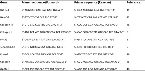 qRT-PCR was used to evaluate the expression of stem-cell marker genes (OCT-4, Nanog) [45], tenocyte related genes (Collagen I, Collagen III and tenomodulin) and non-tenocyte related genes (PPAR-γ, Collagen II and Runx-2) in TSCs isolated from the control and MTR rats. First, TSCs at passage 2 were seeded in 6-well plates at a density of 6 × 104/well and cultured for 7 days. Then, the RNeasy Mini Kit (Qiagen, Valencia, CA) was used to isolate total RNA from TSCs based on the manufacturer’s instructions. First-strand cDNA was synthesized from about 1 µg total RNA using SuperScript II (Invitrogen, Grand Island, NY) by incubating at 65ºC for 5 min, 4ºC for 1 min and 42ºC for 50 min. About 2 µl of cDNA (total 100 ng RNA) from the first strand reaction was used in a final volume of 25 µl in qRT-PCR performed using the QIAGEN QuantiTect SYBR Green PCR Kit (QIAGEN, Valencia, CA). Temperature cycling conditions included incubation for 5 min at 94ºC, followed by 30 to 40 cycles at 94ºC for 1 min, 57ºC for 40 seconds and 72ºC for 50 seconds, and a final incubation at 70ºC for 10 min. All reactions were carried out in a Chromo 4 Detector (MJ Research, St. Bruno, Quebec, Canada). The primers used in these reactions were rat-specific and are previously described: OCT-4 and Nanog [45], Collagen III [46], and Collagen I, tenomodulin, PPAR-γ, Collagen II and Runx-2 [5]. All primers were obtained from Invitrogen (Grand Island, NY) and their sequences are shown in Table 1. The housekeeping gene, GAPDH, was used as an internal control to normalize target gene expression [47]. Relative expression levels of target genes were calculated using the formula: 2−ΔΔCT, where ∆∆CT = (CTtarget - CTGAPDH)MTR - (CTtarget - CTGAPDH)control and CT represents the threshold cycle of each RNA sample. Each reaction had 3 replicates and all 3 CT values were used to determine the mean expression level. Data are presented as mean ± standard deviation (mean ± SD) for each data set. Expression of each gene in the MTR group was compared to the control group from aging rats.
