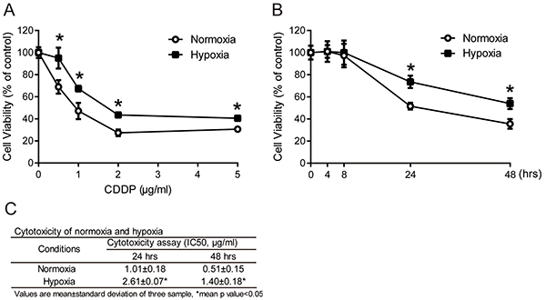 Solid tumors are usually more resistant to chemotherapy and are associated with a poor prognosis in hypoxic microenvironments [9, 10]. To demonstrate the role of hypoxia in drug resistance, the hypoxic microenvironment was mimicked by a hypoxic chamber with a 2% O2 atmosphere. To examine the drug resistance of tumor cells under hypoxia, MCF7 cells were exposed to a common clinical chemotherapeutic medicine, cisplatin (CDDP), in normoxic (20% O2) or hypoxic (2% O2) conditions. Cell viability was measured by MTT assay. The cell viabilities in MCF7 cells increased significantly under hypoxia compared with normoxia after 24 hours of treatment at all concentrations of CDDP (Figure 1A). To further understand the time-dependent cytotoxicity of CDDP on cells, cells were treated with 1 μg/ml CDDP, and cell viability was measured at different time points between 4 and 48 hours. The cell viabilities with CDDP treatment under hypoxia were significantly increased at 24 and 48 hours compared to normoxia (Figure 1B). The IC50 value of MCF7 cells was significantly increased under hypoxia compared to normoxia at 24 (hypoxia: 2.61±0.07 μg/ml, normoxia: 1.01±0.18 μg/ml) and 48 hours (hypoxia: 1.40±0.18 μg/ml, normoxia: 0.51±0.15 μg/ml) (Figure 1C). These results showed that the hypoxic microenvironment leads to a higher drug resistance in cancer cells.