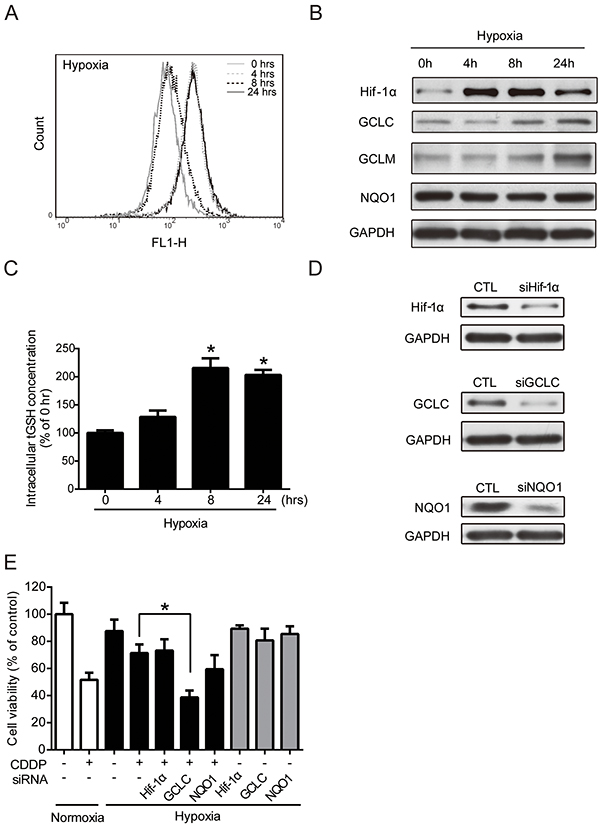 Figure 2: Regulation of antioxidant enzyme activities leads to the alteration of drug resistance under hypoxia. A-D. MCF7 cells were exposed to hypoxia for 0, 4, 8, 24 hours. (A) The intracellular ROS levels were detected by flow cytometry with DCFHDA staining. (B) The total proteins were extracted from the cells and the Hif-1α, NQO1, GCLC, GCLM, GAPDH levels were detected by western blot. (C) The intracellular total GSH (tGSH) activities were measured by glutathione assay. N=3, *, P < 0.05 compared with the 0 hour group. (D, E) MCF7 cells were transfected with negative control siRNA (siCTL) or siRNAs targeting Hif-1α, GCLC, or NQO1. (D) The effects of siRNA knockdown were examined by western blotting. E. After transfection, the cells were treated with 1 μg/ml CDDP for 24 hours under hypoxia. The cell viabilities were examined by MTT assay. N=3, *, P < 0.05 compared to CDDP under hypoxia.