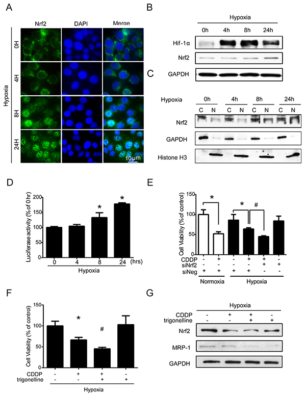 Figure 3: Nuclear translocation of Nrf2 leads to drug resistance under hypoxia. A-C. MCF7 cells were exposed to hypoxia for 0, 4, 8, and 24 hours. (A) Nrf2 localization was determined by immunocytochemistry (ICC) with an anti-Nrf2 antibody (green fluorescence). Nuclear location was determined by DAPI staining (blue fluorescence). (B, C) Total proteins and cytosolic (C)/nuclear (N) proteins were extracted. The protein levels of Hif-1α, Nrf2, GAPDH, and Histone H3 were detected by western blotting. GAPDH was the loading control for the cytosolic fraction, and Histone H3 was the loading control for the nuclear fraction. D. MCF7 cells were transfected with pARE-CMV and pRL-CMV plasmids. After transfection, the cells were exposed to hypoxia for 0, 4, 8, and 24 hours, and the firefly and Renilla luminescence activities were detected by Dual-Glo luciferase assay. The luciferase activity was represented by firefly luminescence normalized with Renilla luminescence. N=3, *, P < 0.05 compared with the 0 hour group. E. MCF7 cells were treated with negative siRNA (siNeg) and Nrf2 siRNA for 24 hours under hypoxia, and the cell viability was determined by MTT. N=3, *, P < 0.05 compared with the control. #, P < 0.05 compared with CDDP treatment. F, G. MCF7 cells were treated with 1 μg/ml CDDP combined with or without 3 hours of pretreatment with trigonelline (Nrf2 inhibitor) or 1 μM trigonelline alone. (F) The cell viability was determined by MTT. N=3, *, P < 0.05 compared with the control. #, P < 0.05 compared with the CDDP treatment. (G) The total proteins were extracted from the cells and the Nrf2, MRP-1, and GAPDH levels were detected by western blotting.