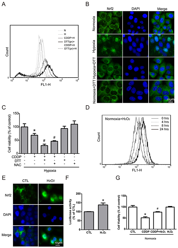 Figure 4: Nrf2 activation is increased by hypoxia-induced intracellular ROS production. A. MCF7 cells were pretreated with DTT (DTTpr) for 2 hours and followed by combined treatment with CDDP under hypoxia (H) for 24 hours. The intracellular ROS levels were detected by flow cytometry with DCFHDA staining. N indicates normoxic conditions, and H stands for the hypoxia. B. Cells were pretreated with DTT for 3 hours under 24 hours of hypoxia, and the localization of Nrf2 was determined by ICC with anti-Nrf2 antibody (green fluorescence). Nucleus was stained by DAPI (blue fluorescence). C. Cells were pretreated with DTT or NAC for 3 hours, and CDDP was added to treat cells for 24 hours under hypoxia. The cell viability was measured by MTT. N=3, *, P < 0.05 compared with the control group. #, P < 0.05 compared with the CDDP group. D. MCF7 cells were treated with 40 μM H2O2 for 0-24 hours and the intracellular ROS levels were detected by flow cytometry with DCFHDA staining. E. The localization of Nrf2 was determined by ICC with anti-Nrf2 antibody (green fluorescence). The nucleus was stained with DAPI (cyan fluorescence). F. The luciferase activity was measured by Dual-Glo luciferase assay with 24 hours of H2O2 treatment. N=3, *, P < 0.05 compared with the control group. G. Cells were pretreated with H2O2 for 3 hours, and CDDP was then added to treat cells for 24 hours under normoxia. The cell viability was measured by MTT. N=3, *, P < 0.05 compared with the control group. #, P < 0.05 compared with the CDPP treatment group.