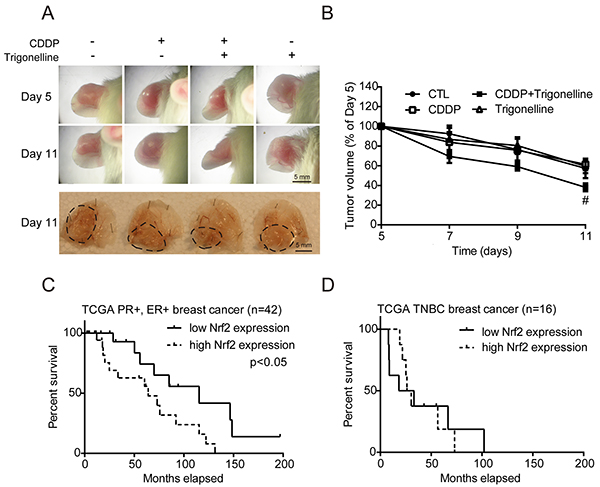 Figure 6: CDDP combined with trigonelline treatment can effectively treat tumors in mice, and the TCGA breast cancer data show the importance of Nrf2 in the survival rate of patients. MCF7 cells were injected into the ears of 10-week-old male ICR mice. Mice were randomly separated into four groups, including PBS (CDDP-/ trigonelline-), CDDP, CDDP combined with trigonelline, and trigonelline alone. A. Drugs were administered to the tumors on days 5, 7, 9 and 11 after cell injection, and the pictures were taken on day 5 and day 11. Dashed lines indicated the tumor outline (upper panel: whole ear; lower panel: ears without upper surface skin). B. The tumor volumes were measured by digital caliper. N=3, #, P < 0.05 compared to the CDDP treatment group. C, D. Relapse-free survival data were from the TCGA database. The breast cancer data were classified into the ER+/PR+ group and TNBC group. The survival data from two groups were used to generate survival curves with separation of high Nrf2 or low Nrf2 expression. The p-values were examined by Mantel-Cox log-rank test.