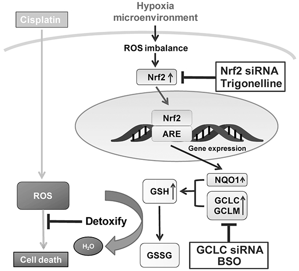 Figure 7: Model of Nrf2-induced drug resistance under hypoxia. A schematic diagram of Nrf2-induced drug resistance under hypoxia and the modulation in MCF7 was shown. Nrf2 activity was evoked by the hypoxia-induced ROS imbalance, and the downstream GCLC enzyme was essential to increase the glutathione content to detoxify the cytotoxicity of CDDP. siNrf2, trigonelline, siGCLC, and BSO can block hypoxia-induced drug resistance, and may be useful as therapeutic agents combined with chemotherapeutic drugs.