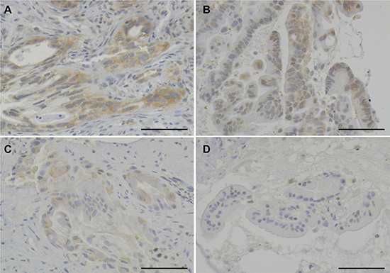Figure 1: The immunohistochemical analysis for HSP27. The expression level score of HSP27 in patients with pancreatic cancer was highly case-dependent. Representative staining panels for the grade +3 (A), +2 (B), +1 (C), and 0 (D) cases are shown (original magnification: ×200). Scale bars indicate 100 μm.