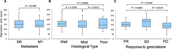 Figure 3: A comparison of HSP27 expression level scores in patients based on the presence or absence of metastasis (A), histological type (B), and response to gemcitabine-based chemotherapy (C). Abbreviations: M0, distant metastasis (−); M1, distant metastasis (+); Well, well-differentiated adenocarcinoma; Mod, moderately differentiated adenocarcinoma; Poor, poorly differentiated adenocarcinoma; PR, partial response; SD, stable disease; PD, progressive disease.
