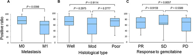 Figure 4: A comparison of the positive p-HSP27 ratios in patients based on the presence or absence of metastasis (A), histological type (B), and response to gemcitabine-based chemotherapy (C). Abbreviations: M0: distant metastasis (−); M1, distant metastasis (+); Well, well-differentiated adenocarcinoma; Mod, moderately differentiated adenocarcinoma; Poor, poorly differentiated adenocarcinoma; PR, partial response; SD, stable disease; PD, progressive disease.
