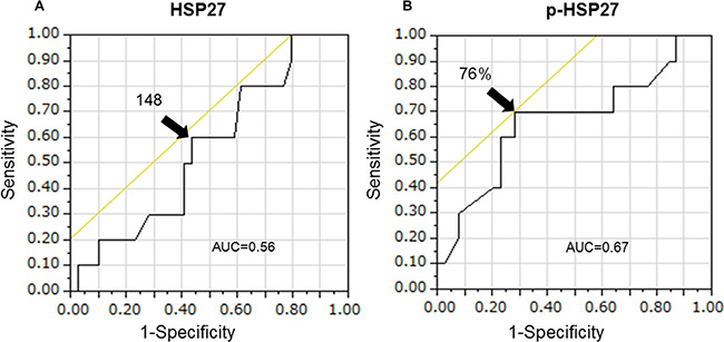 Figure 5: The area under the curve (AUC) values for the HSP27 expression level score (A) and a positive p-HSP27 ratio (B) are 0.56 and 0.67, respectively.
