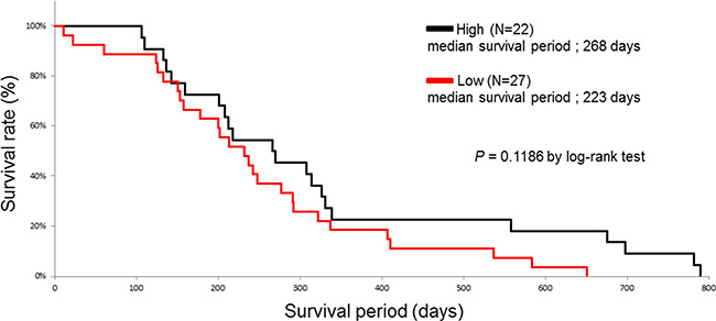 Figure 7: The Kaplan-Meier curves for the survival of pancreatic cancer patients with high (black line) and low (red line) positive p-HSP27 ratios.
