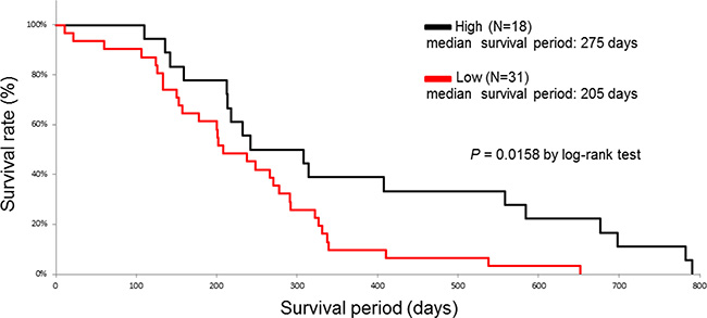 The study population included 49 pancreatic cancer patients (female, n = 22; male, n = 27; median age, 68 years [range: 31–86 years]) who underwent EUS-FNA at the department of Gastroenterology, Gifu University Hospital between September 2004 and October 2011. The patients’ demographic and clinicopathological characteristics are shown in Table 3. Metastasis was recognized in 27 patients (55%). Nineteen (39%) cases were well-differentiated (well), 19 (39%) were moderately differentiated (mod), and 11 (22%) cases were poorly differentiated adenocarcinoma (poor). All of the patients received gemcitabine-based chemotherapy. Their treatment responses included a partial response (PR) in 4 cases (8%), stable disease (SD) in 13 cases (27%), and progressive disease (PD) in 32 cases (65%).