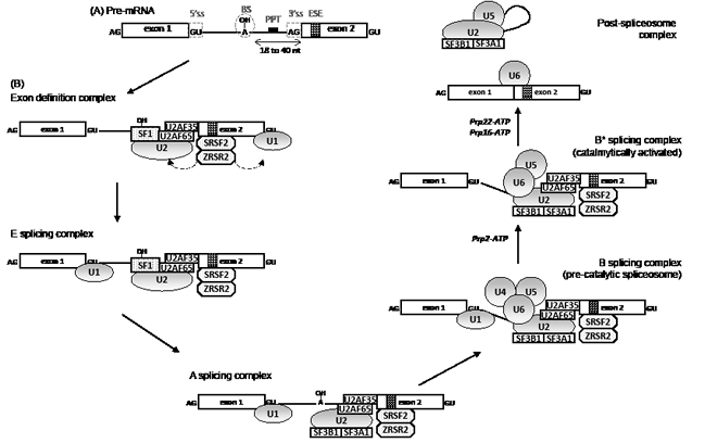 RNA splicing is initiated by the recognition of 5’ splice site by an U1 snRNP complex. The splicing factor 1 (SF1) complex, via its component SF3B1, binds to the branchpoint sequence located upstream of the 3’ end of the intron to protect the region before the splicing reaction. A complex that contains an U2 auxiliary factor (AF) 35/65 heterodimer, ZRSR2, and one of the serine-arginine (SR)-rich splicing factors, SRSF1 or SRSF2, is recruited to the polypyrimidine tract located between the branchpoint and the 3’ splice site. SRSF1 and SRSF2 play a role in preventing exon skipping, thus regulating alternative splicing. U2AF65 binds the polypyrimidine tract, while U2AF35, also known as U2AF1, interacts with the AG splice acceptor dinucleotide of the target intron at the 3’ splice site. ZRSR2 selectively binds to the 3’ splice site of U2 dependent pre-mRNA. Together with U2AF heterodimer, SF1 participates to the establishment of the E splicing complex. Then, the U2 snRNP complex, which contains the SF3b subcomplex made of SF3B1 and SF3A1 proteins, displaces SF1 to generate the A splicing complex. This step is followed by the incorporation of the U4/U6-U5 snRNP complexes. Lastly, the release of U1 and U4 snRNP changes the conformation of the complex for the spliceosome to become catalytically competent [16]. The E/A complexes are involved in the recognition of pre-mRNA during the very first steps of splicing, more precisely to the recognition of the polypyrimidine track and the acceptor splice site and also the exon splice enhancer (Figure 1).