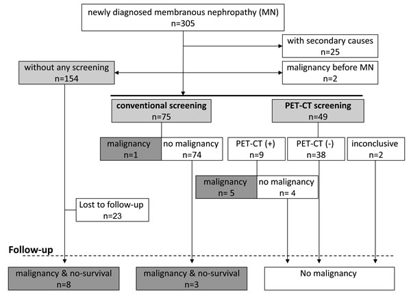 Between November 2007 and April 2014, 305 consecutive patients were newly diagnosed with MN (Figure 1).Of these,124 presumed idiopathic MN patients with a physical examination not suspicious for cancer underwent screening for an occult malignancy with either FDGPET/CT scanning (n = 49) or the conventional screening (n = 75) (Figure 1). Of these remaining 154 MN patients, they refused to received any screening. The baseline characteristics of 3 cohorts were similar (Table 1).