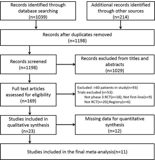 Our search strategy yielded 1253 potential relevant studies, of which 169 potential eligible articles were analyzed and 158 reports that did not meet eligibility criteria were excluded from our analysis (Figure 1). Thus, there were altogether 11 studies up to January 2016 found to be eligible for the final network meta-analysis [9-19]. Table 1 summarizes the characteristics of the included trials. A total of 7597 patients in twelve different treatment arms were assessed: IFN-α alone, temsirolimus alone, sorafinib alone, sunitinib alone, pazopanib alone, axitinib alone, tivozanib alone, IFN-α+IL-2 + fluorouracil, bevacizumab + IFN-α, IFN-α+placebo, temsirolimus+bevacizumab and placebo. Figure 2 shows the network of eligible comparisons for the network meta-analysis.