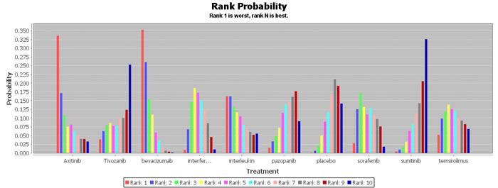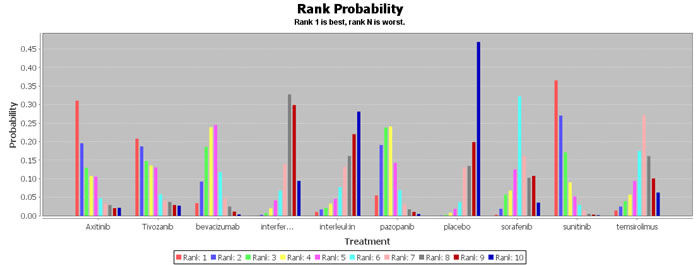 In the present study, the results from our indirect comparisons indicated that sunitinib was more efficacious than IFN-α and placebo, which had significant differences between each pair of arms. The overall trend of our network meta-analysis was that targeted therapies had better efficacy and safety which was in accordance with previous studies [20]. Ranking of treatment arms showed that sunitinib had the highest probability of being the best first-line choice for patients with mRCC, because sunitinib not only ranked top in terms of efficacy, but also ranked among the best of safety aspects.