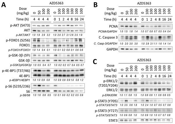 Figure 1: In vivo pharmacodynamic activity of AZD5363 in mouse PTEN-deficient prostate tumors. Twenty-week-old PTEN-KO mice (n = 3 mice per group) bearing prostate tumors were treated with AZD5363 for the indicated dosage and times. Tumors lysates were pooled and were examined by western blot for the expression of proteins and/or phosphorylation of AKT and its downstream targets A., markers of proliferation and apoptosis B., and markers of the MAPK and JAK/STAT3 signaling pathway C. Gel densitometry was quantified with ImageJ.