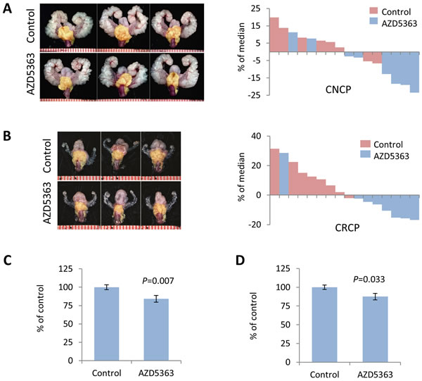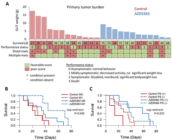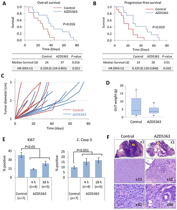 A summary of the animal characteristics and treatment outcomes is shown in Table 1. There were no significant differences in the starting age, initial and final body weights between mice randomized to treatment with AZD5363 and control. Mice treated with AZD5363 demonstrated significant improvements in overall survival and progression-free survival compared to controls (Figure 8A-8B). Overall, primary tumors from mice receiving AZD5363 demonstrated decreased growth rates and tended to be smaller compared to control mice at post mortem, median GUT weight 3.6 vs. 4.3 g, P = 0.845, respectively (Figure 8C-8D).