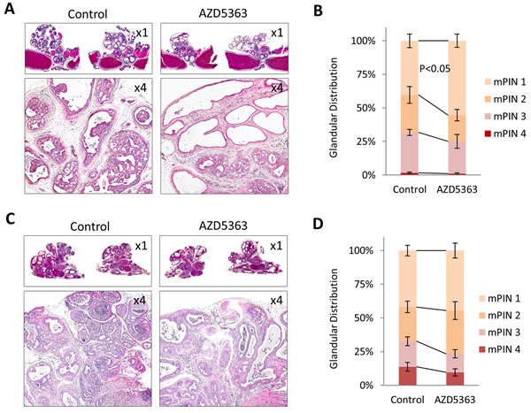 Figure 3: Treatment with AZD5363 reduces PTEN-deficient tumor progression. Representative H&E stained sections of CNPC A., and CRPC C., from control and AZD5363 treated mice. Histopathological analysis of mPIN distribution in CNPC B., (n = 8 mice per group) and CRPC D., (n = 5 mice per group).