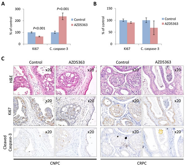 Figure 4: Effects of chronic AZD5363 treatment on tumor proliferation and apoptosis. IHC quantification of proliferation (Ki67) and apoptosis (cleaved caspase-3) in CNPC A., (n = 6 mice per group, and CRPC B., (n = 5 mice per group). Values represent mean ± s.e. C. Representative images of H&E stained CNPC or CRPC tumor from control and AZD5363 treated mice and their corresponding serial sections immunostained with Ki67and cleaved caspase-3.