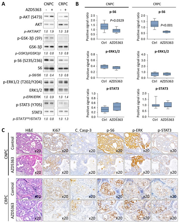 We next sought to investigate the effects of chronic AZD5363 therapy on the activation of the PI3/AKT signaling as well as the status of MAPK and JAK/STAT3 signal transduction. Consistent with the PD data, western blot analysis revealed that AZD5363 effectively inhibited the phosphorylation of S6 in both animal models (Figure 5A-5B). Overall, chronic dosing of AZD5363 did not appear significantly affect the phosphorylation of molecular targets of MAPK and JAK/STAT3 (Figure 5A-5B). However, IHC analysis revealed that proliferative active regions expressed high levels of both phosphorylated ERK and STAT3 despite reduced S6 activity in CNPC (Figure 5C). In CRPC, the overall expression of phosphorylated S6 was reduced but remained active in certain tumor cells which tended to also express increased phosphorylated ERK and STAT3 (Figure 5C). Overall, these findings show that AZD5363 is capable of inhibiting AKT activity thus reducing tumor growth and progression in early-stage models of CNPC and CRPC.