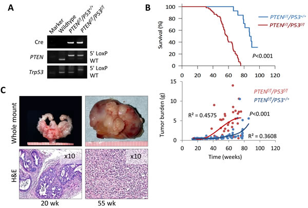 Genotyping for the Cre-recombinase, PTEN and P53 was performed by PCR using tail biopsy DNA. DNA was extracted using the alkaline extraction method as previously described [17]. PCR primers and conditions are listed in Supplementary Table S3.