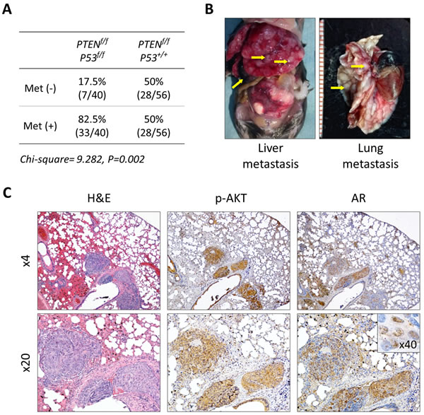 Figure 7: Development of metastatic prostate cancer in PTEN/P53-DKO mice. A. Comparison of metastatic prostate cancer development in conditional PTEN and PTEN/P53 knockout mice. B. Representative images of distant metastasis in PTEN/P53-DKO mice. C. Histological and IHC staining of phosphorylated AKT and AR prostate cancer metastasis growing in lung.