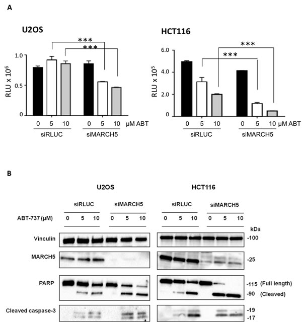 Figure 1: MARCH5 depletion sensitizes cell lines to BH3-mimetic induced apoptosis A. U2OS and HCT116 cells transfected with siRNA targeting MARCH5 or a control siRNA targeting luciferase were treated for 24 h with ABT-737 at the indicated concentrations. Viability was measured with Cell Titer Glo. Error bars are standard deviation from triplicate experiments. The asterisks (***) indicate a p value of < 0.001 compared to the respective controls using Student’s unpaired t-test. B. Lysates from U2OS and HCT116 cells transfected with siRLUC or siMARCH5 and treated with ABT-737 at the indicated concentrations for 24 h were subjected to SDS-PAGE and western blotting.