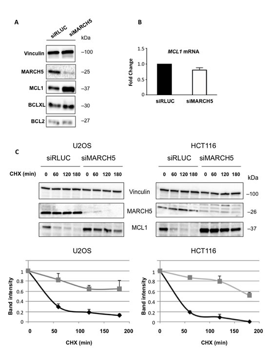 Figure 2: Loss of MARCH5 leads to stabilization of MCL1 A. Lysates from HCT116 cells transfected with control siRNA (siRLUC) or siRNA targeting MARCH5 were subjected to SDS-PAGE and western blotting. B. MCL1 mRNA levels were measured following MARCH5 knockdown using quantitative RT-PCR and were normalized to 18S mRNA. Error bars indicate the SD of triplicate measurements. C. Cycloheximide pulse-chase experiments were performed by treating transfected cells with cycloheximide for the given time points. Lysates were subjected to SDS-PAGE and immunoblot analysis to observe MCL1 stability. Western blot panels are representative of three independent experiments. Graphs show the MCL1 protein band intensities normalized to the loading control. Black diamonds, siRLUC; gray squares, siMARCH5. Error bars are standard deviation of triplicate experiments.