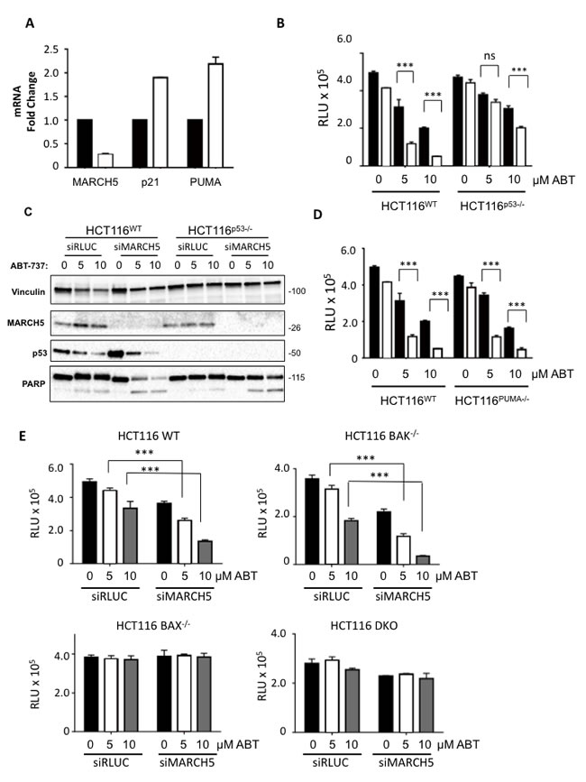Figure 3: MARCH5 depletion upregulates p53 transcriptional targets and sensitizes cells to p53- and BAX-dependent apoptosis A. The expression of MARCH5 mRNA, and the p53 targets-PUMA and p21, following control siRNA (black bars) or MARCH5 knockdown (white bars) in HCT116 cells were assessed by quantitative RT-PCR. Error bars indicate the SD of triplicate measurements. B. Isogenic HCT116WT and HCT116p53-/- cells were transfected with control siRNA (black bars) or siRNA targeting MARCH5 (white bars) and treated with ABT-737 at the indicated concentrations. Cellular viability was measured using the CellTiter Glo assay. Error bars indicate the SD of triplicate experiments. C. HCT116WT and HCT116p53-/- cells were transfected with siRLUC or siMARCH5 and treated with ABT-737 at the indicated concentrations. Whole cell lysates were harvested and subjected to SDS-PAGE and western blot analysis. D. Isogenic HCT116WT and HCT116PUMA-/- cells were transfected with control siRNA (black bars) or siRNA targeting MARCH5 (white bars) and treated with ABT-737 at the indicated concentrations for 24 h. Cellular viability was measured using the CellTiter Glo assay. E. WT, BAK-/-, BAX-/- and BAK/BAX DKO HCT116 cells were depleted of MARCH5 and treated with ABT-737 at the given concentrations. Error bars are standard deviation. For all graphs, the asterisks (***) indicate a p value of < 0.001 and “ns” indicates no significant difference compared to the respective controls using Student’s unpaired t-test.