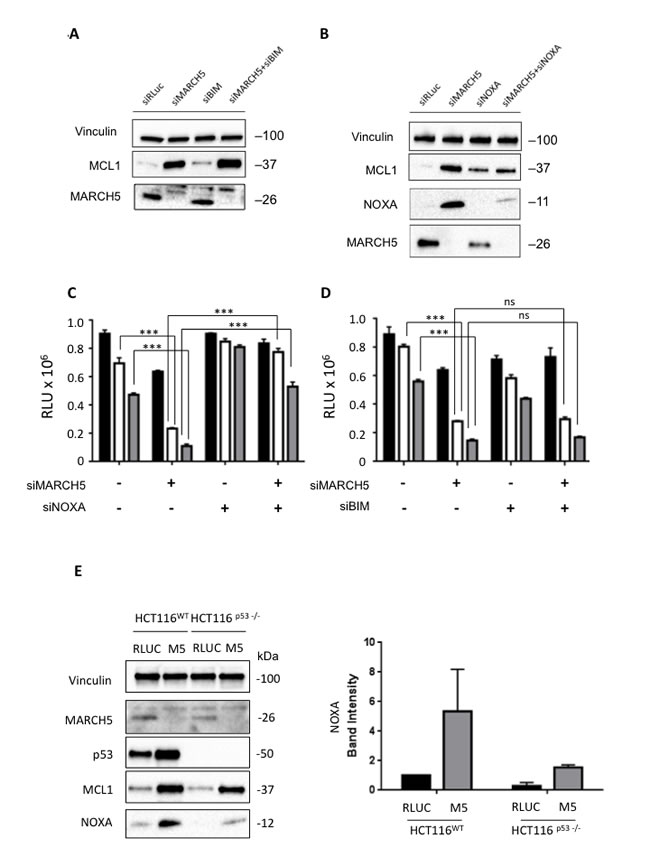 Figure 4: Sensitization to apoptosis and MCL1 stabilization upon MARCH5 loss are NOXA-dependent A. Lysates from HCT116 cells transfected with the indicated siRNAs were subjected to SDS-PAGE and western blotting. Due to poor antibody immunoreactivity, validation of BIM knockdown was performed using qPCR (Figure S7). B. Lysates from HCT116 cells transfected with the indicated siRNAs were subjected to SDS-PAGE and western blotting. C. HCT116 cells transfected with siRLUC, siMARCH5, siNOXA or co-transfected with siMARCH5/siNOXA were treated with DMSO (black bars) or ABT-737 (5 or 10 μM, white or gray bars, respectively). D. HCT116 cells transfected with siRLUC, siMARCH5, siBIM or co-transfected with siMARCH5/siBIM were treated with DMSO (black bars) or ABT-737 (5 or 10 μM, white or gray bars, respectively). Error bars are standard deviation from 3 independent experiments. Validation of knockdown for panels C. and D. was performed by quantitative RT-PCR, and mRNA levels were normalized to 18S mRNA (Figure S7). E. HCT116WT and HCT116p53-/- cells were transfected with control siRNA or siRNA targeting MARCH5. Lysates were then subjected to SDS-PAGE and western blotting. NOXA induction was quantified from triplicate independent experiments.