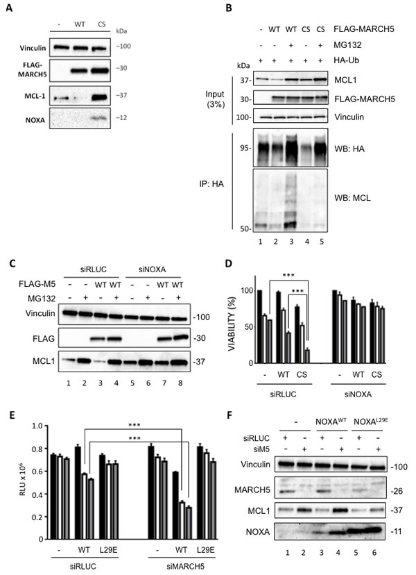 We thank Professor Nobuhiro Nakamura (Tokyo Institute of Technology) for the MARCH5 antibody, Dr. Simona Polo (IFOM, Milan) for advice on the ubiquitylation assays, and Dr. Damien Arnoult (INSERM, France) for helpful discussions related to MARCH5. Many thanks also to Professor Geoffrey Wahl (Salk Institute) for providing support in the initial stages of the project. We appreciate comments on the manuscript from Michela Mattioli and Fernanda Ricci. We gratefully acknowledge Professor Saverio Minucci and Dr. Mohammed Elgedy (IEO, Milan) for providing reagents, and Professor Andreas Villunger and Dr. Luca Fava (Medical University, Innsbruck) for sharing the inducible NOXA cell lines.