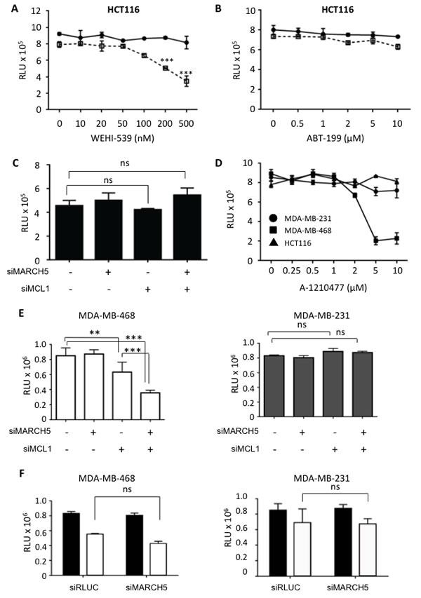 Figure 7: MARCH5 loss is synthetic lethal with the BCLXL inhibitor, WEHI-539, and with MCL1 depletion in MCL1-driven breast cancer lines HCT116 cells transfected with siRLUC (closed circles) or siMARCH5 (open squares) were treated with WEHI-539 A. or ABT-199 B. at the indicated doses. C. HCT116 cells were depleted of MARCH5, MCL1, or both, and viability was assessed with Cell Titer Glo. D. HCT116, MDA-MB-231, and MDA-MB-468 cells were treated with the MCL1 specific inhibitor, A1210477 at the indicated concentrations and viability was assessed with Cell Titer Glo. E. MDA-MB-231 and MDA-MB-468 cells were depleted of MARCH5 or MCL1, or both. Validation of knockdown was performed by quantitative RT-PCR and mRNA levels were normalized to 18S mRNA (Figure S7). F. MDA-MB-231 and MDA-MB-468 cells were transfected with control siRNA or siRNA targeting MARCH5 and treated with DMSO (black bars) or 10 μM ABT-737 (white bars). Error bars are standard deviation from at least 3 replicate experiments