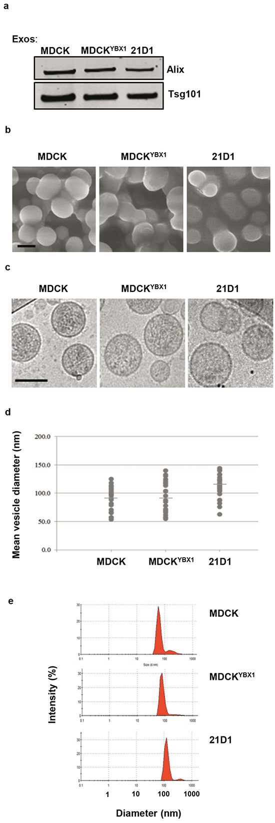EVs were isolated from MDCK, MDCKYBX1 and 21D1 cells using established workflows (Supplementary Figure S1) based on OptiPrep™ density gradient ultracentrifugation [22, 24]. Western blotting analysis showed Fraction 7, corresponding to a density of 1.09 g/mL, to have the greatest expression of exosome markers (Supplementary Figure S2), and was selected for further characterization. Fraction 7 vesicles from all cell lines showed robust expression of ESCRT machinery proteins Alix and TSG101 (Figure 1a), and scanning electron microscopy revealed spherical architecture with textured surfaces (Figure 1b). Additionally, cryo-electron microscopy and cross sectional analysis displayed densely-staining vesicular contents (Figure 1c), while size distribution indicated a homogenous population of vesicles ranging between 50-140 nm (Figure 1d). Additionally, dynamic light scattering indicated a slightly increasing mean vesicle diameter measuring 84.2nm (MDCK), 95.5 nm (MDCKYBX1) and (108.5 nm) (21D1) (Figure 1e). Based on these observed characteristics, Fraction 7 vesicles were classified as exosomes and used in downstream experiments.