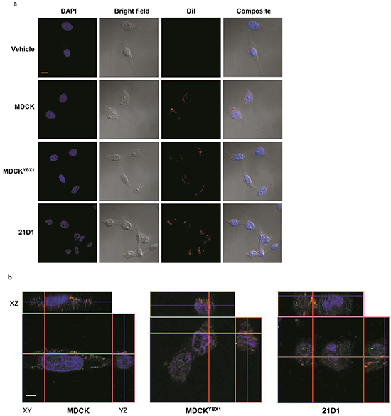 MDCK and derivative cell lines (MDCKYBX1 and 21D1) were generated as described previously [20, 21, 23]. Endothelial cell lines (2F-2B and HUVEC) were obtained from the American Type Culture Collection (Manassas, VA, USA). Cells were cultured in Dulbecco's Modified Eagle's Medium (DMEM) with 10% fetal bovine serum (FBS), at 37 °C with 10% CO2.