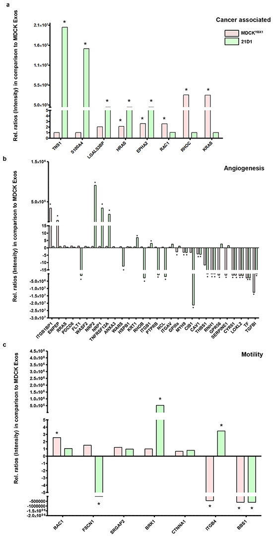 Figure 4: Proteomic-based quantification of factors enriched in MDCKYBX1 or 21D1 exosomes, compared to MDCK exosomes. Exosomes were isolated from all three EMT cell lines and subjected to mass spectrometry analysis. Label-free quantification using LFQ intensity (MaxQuant) was used to reveal significant enrichment of factors associated with a. cancer progression, b. angiogenesis, and c. cell motility in MDCKYBX1 or 21D1 exosomes, relative to MDCK exosomes (n=2, *p<0.05).