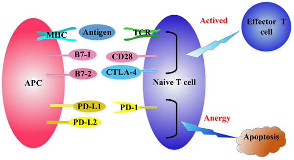 Figure 1: The regulation of T cell activation. T cell receptor (TCR) recognizes the tumor antigens in the context of major histocompatibility complex (MHC) expressed on professional antigen presenting cells (APCs). Then APCs deliver a second signal by positive co-stimulatory molecules CD28/B7-1/B7-2 to fully activate naive T cells. CTLA-4 can bind with B7-1/B7-2 competitively to inhibit the activation of CD28/B7-1/B7-2, resulting in inactivation of T cells. PD-1 binds with its ligands, PD-L1 and PD-L2 to attenuate lymphocyte activation.