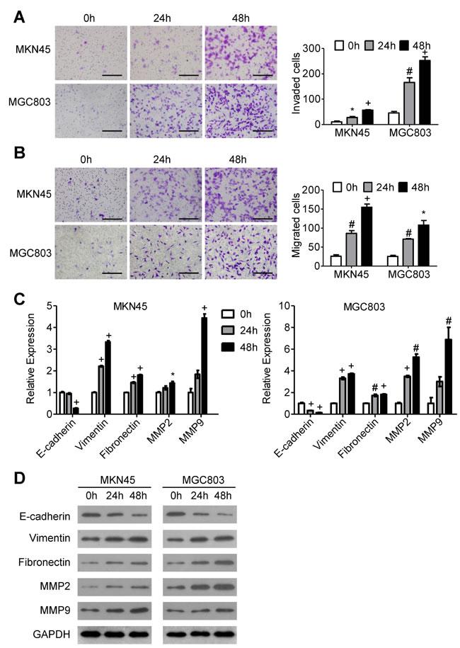Figure 1: The effects of ACh on GC cell invasion, migration and EMT. MKN45 and MGC803 cells were incubated with ACh (10 µM) for the indicated times. (A, B) Invasion A. and migration B. of MKN45 and MGC803 cells in transwell assays (scale bar = 200 μm). C. qRT-PCR analysis showing relative mRNA expression of the EMT markers E-cadherin, vimentin, fibronectin, MMP2 and MMP9. mRNA levels were normalized to the level of GAPDH mRNA. D. Western blots showing the protein expression of the indicated EMT markers. Quantitative data are presented as the mean±SEM from three independent experiments. *P < 0.05, #P < 0.01, +P < 0.001.