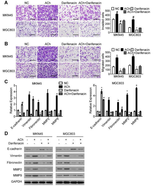 Figure 2: M3Rs mediate the effects of ACh on GC cell invasion, migration and EMT. MKN45 and MGC803 cells were pretreated with darifenacin (10 µM) before incubation with ACh (10 µM), PBS was used as a negative control (NC). (A, B) Invasion A. and migration B. of MKN45 and MGC803 cells in transwell assays (scale bar=200 μm). C. qRT-PCR analysis showing relative mRNA expression of the indicated EMT markers. mRNA levels were normalized to the level of GAPDH mRNA. D. Western blots showing the protein expression of the indicated EMT markers. Quantitative data are presented as the mean±SEM from three independent experiments. Experimental groups were compared to the negative control group. *P < 0.05, #P < 0.01, +P < 0.001.