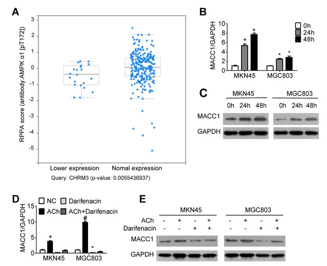 Figure 3: MACC1 expression is regulated by ACh and M3R. A. Stomach adenocarcinoma data from the TCGA database was retrieved and analyzed using a tool in http://www.cbioportal.org/. Each blue dot represents one case of stomach adenocarcinoma. AMPK phosphorylation at T172 correlated positively with expression of CHRM3 mRNA (encoding M3R). (B, C) Effects of ACh on expression of MACC1 mRNA B. mRNA and protein C. detected using qRT-PCR and western blotting, respectively. MKN45 and MGC803 cells were pretreated with the M3R inhibitor darifenacin (10 µM) before ACh. (D, E) Effect of darifenacin on ACh-induced expression of MACC1 mRNA D. and protein E.. Quantitative data were presented as the mean±SEM from three independent experiments. Experimental groups were compared to the negative control group. *P < 0.05, #P < 0.01, +P < 0.001.