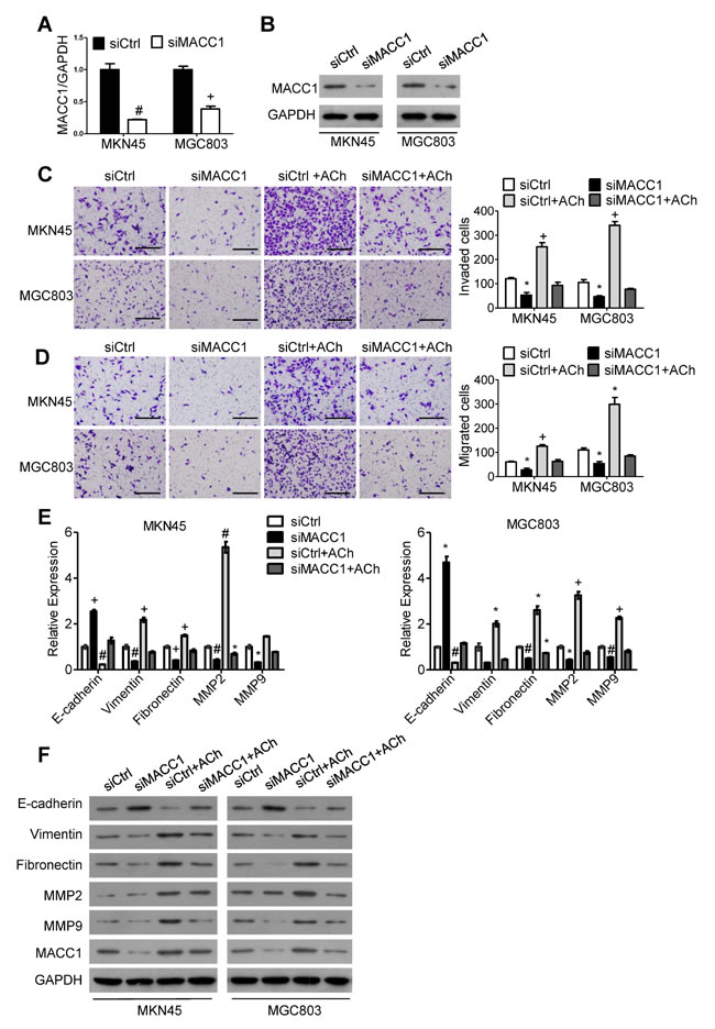 Figure 4: MACC1 mediates ACh promotion of GC cell invasion, migration and EMT. (A, B) Efficiency of MACC1 knockdown was determined using qRT-PCR A. and western blotting B.. (C, D) Invasion C. and migration D. by MKN45 and MGC803 cells in transwell assays (scale bar=200 μm). E. qRT-PCR analysis showing relative mRNA expression of the indicated EMT markers. mRNA levels were normalized to the level of GAPDH mRNA. F. Western blots showing the protein expression of the indicated EMT markers. Quantitative data were presented as the mean±SEM from three independent experiments. Experimental groups were compared to the negative control group. *P < 0.05, #P < 0.01, +P < 0.001.
