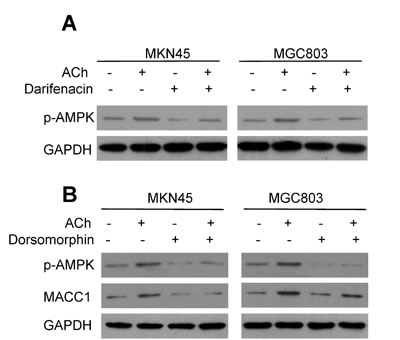 To further confirm that p-AMPK is involved in the positive regulation of ACh/M3R on MACC1 expression, we treated MKN45 and MGC803 cells with ACh and then used western blotting to assess the p-AMPK levels. The results showed that p-AMPK levels increased after ACh stimulation, and pretreatment of darifenacin attenuated the ACh-induced increase of p-AMPK (Figure 5A). This indicates that p-AMPK is a downstream signal for M3R in GC cells. When MKN45 and MGC803 cells were treated with the p-AMPK inhibitor dorsomorphin, ACh-stimulated up-regulation of MACC1 was greatly inhibited (Figure 5B). It thus appears ACh acts via M3R and p-AMPK to up-regulate MACC1.