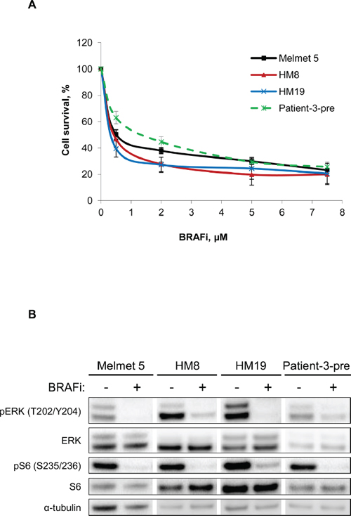 Figure 1: Melanoma cells grown as mono-cultures show good response to BRAFi. A. Four different melanoma cell lines grown as mono-cultures were treated with different doses of BRAFi for 72 h before the effect on melanoma cells was scored by measuring bioluminescence. The signal intensity in the treated cells was related to the intensity in the non-treated controls and presented in % (average ± SEM, n ≥ 3). B. Western blot analysis of the levels of the indicated proteins (α-tubulin, as a loading control) in non-treated or treated (with 1 μM BRAFi for 24 h) melanoma cells.