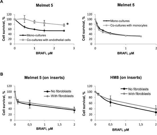 Figure 3: Melanoma cell sensitivity to BRAFi in the presence of endothelial cells, monocytes or fibroblasts separated by a semi-permeable membrane. A. Melanoma cells were grown either as mono-cultures or co-cultures with endothelial cells HUVEC or monocytes THP-1. B. Melanoma cells were grown on semi-permeable inserts, where the fibroblasts or the respective melanoma cells (“No fibroblasts”= Controls) were grown in the bottom chamber. Cells were treated with different doses of BRAFi for 72 h before the drug effect was scored by bioluminescence (A) or the MTS (B) method. The effect on melanoma cells is presented as % relative to the respective non-treated controls (average ± SEM, n ≥ 3); *, p ≤ 0.05 at doses ≥ 1 μM (unpaired t-test).