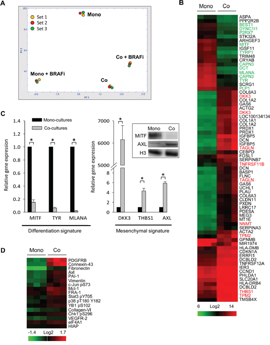 Figure 4: Fibroblasts induce global gene expression changes in melanoma cells. Melmet 5 melanoma cells, grown either as mono-cultures or co-cultures with fibroblasts were treated with 1 μM BRAFi for 24 h (controls were not treated), isolated by FACS and analyzed for gene expression (A-C) or protein levels (D). A. A PCA plot showing the variance between four groups (3 sets): non-treated mono-cultures (Mono) and co-cultures (Co), and BRAFi-treated mono-cultures (Mono+BRAFi) and co-cultures (Co+BRAFi). B. A heatmap showing gene expression levels in melanoma cells from co-versus mono-cultures (n=3). The scale bar indicates signal intensity, where green and red colors indicate low and high expression, respectively. Gene names labeled in green denote differentiation signature genes, while genes in red denote invasive/mesenchymal signature genes reported previously [32, 33]. C. Relative gene expression of differentiation and mesenchymal signature genes, detected by q-PCR (average ± SEM, n=3); *, p < 0.05. The expression level in the co-cultures was normalized to the level in the mono-cultures set to 1. Insert: MITF and AXL expression changes were confirmed by Western blotting (histone 3 (H3) as a loading control). D. A heatmap from the RPPA analysis that shows significantly enriched (at least by 20%) proteins in the melanoma cells from the co-cultures versus the mono-cultures (n=3). Proteins are ranked based on fold-enrichment, with the most enriched at the top.