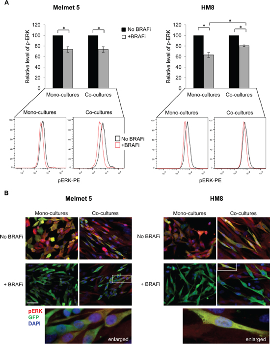 Figure 5: The level of pERK in BRAFi treated melanoma cells from mono-cultures or co-cultures with fibroblasts. Melanoma cells were grown as mono-cultures or co-cultures with fibroblasts and treated with 1 μM BRAFi for 24 h (controls were not treated) before analysis for pERK by flow cytometry (A) or immunofluorescence (B). A. pERK median level in treated melanoma cells relative to the level in the respective non-treated controls (set to 100) is shown. Data indicates average ± SEM, n≥3; *, p< 0.05 (unpaired t-test). Lower panel: representative histograms indicating pERK levels in single melanoma cells. B. The cultures were immunostained for pERK (red) and GFP (green); cell nuclei were stained with DAPI. Only overlay pictures are shown (enlarged region indicated). Scale bar, 50 μm.