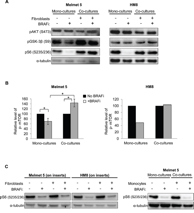 Figure 6: The level of PI3K/AKT/mTOR signaling-associated proteins in BRAFi-treated melanoma cells with/without stromal cells present. A, B. Melanoma cells were grown as mono-cultures or co-cultures with fibroblasts, treated with 1 μM BRAFi for 24 h (controls were not treated), isolated by FACS and analyzed for the indicated proteins by Western blotting (α-tubulin as a loading control) (A) or automated Simple Western (B). (B) p-mTOR level (after normalization to the loading control, GAPDH) in the treated cells relative to the respective non-treated controls (set to 100). Average ± SEM (n=3 for Melmet 5; n=1 for HM8); *, p< 0.05 by unpaired t-test. C. Western blot analysis of pS6 in melanoma cells grown/treated on semi-permeable inserts with/without fibroblasts in the bottom chamber or as co-cultures in the presence of monocytes THP-1.